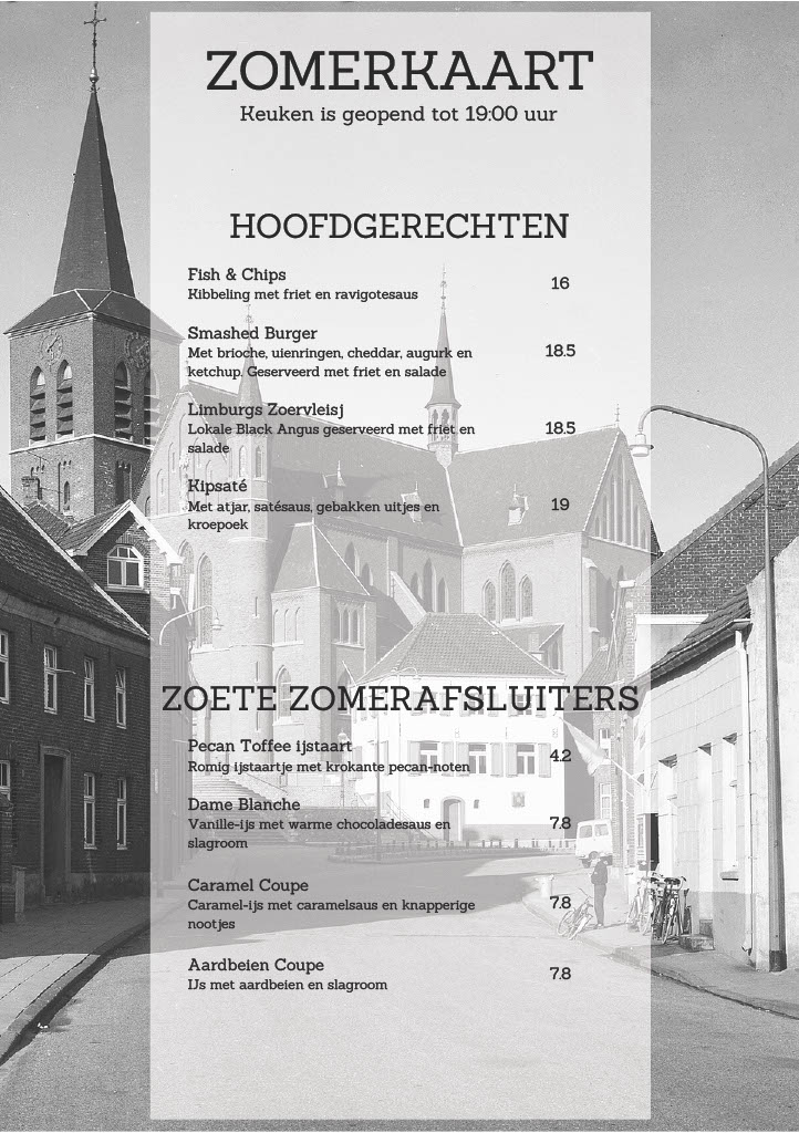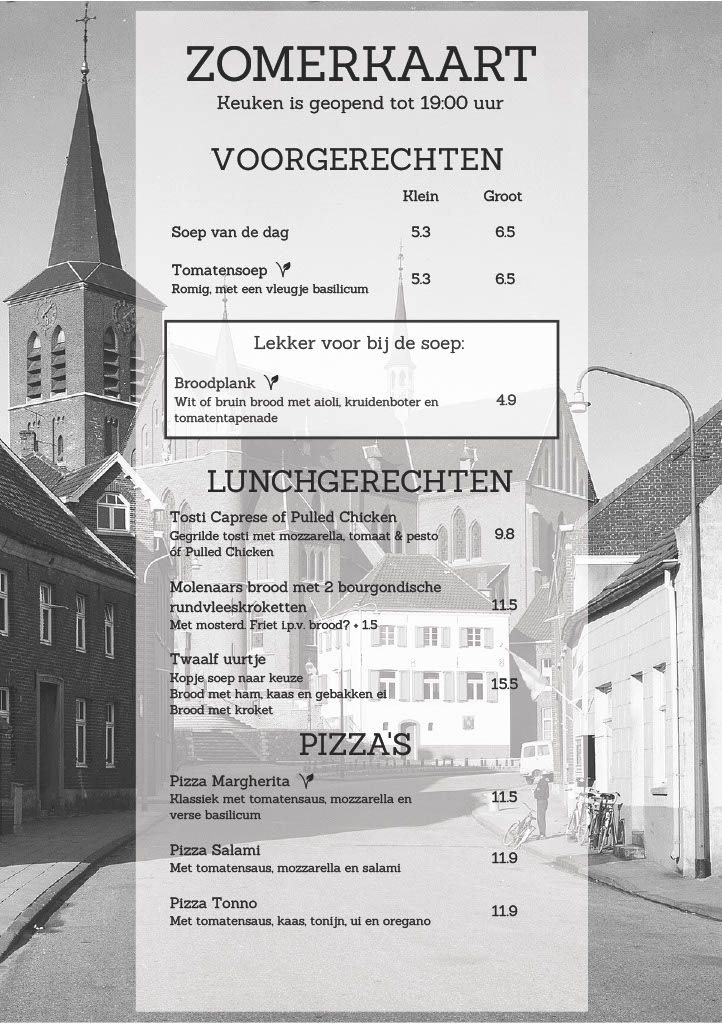 Hieronder vindt u onze speciale zomerkaart. Deze kaart is met zorg samen gesteld door Marjo en biedt voor ieder wat wils. De keuken is iedere dag van 12.00 tot 19.00 geopend. Na 19.00 kunt nog wel gerechten van onze borrelkaart bestellen. Na de zomer zal de kaart verder uitgebreid worden.